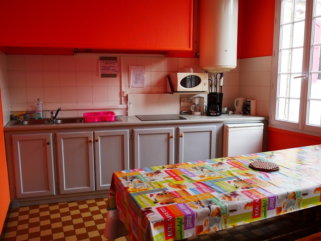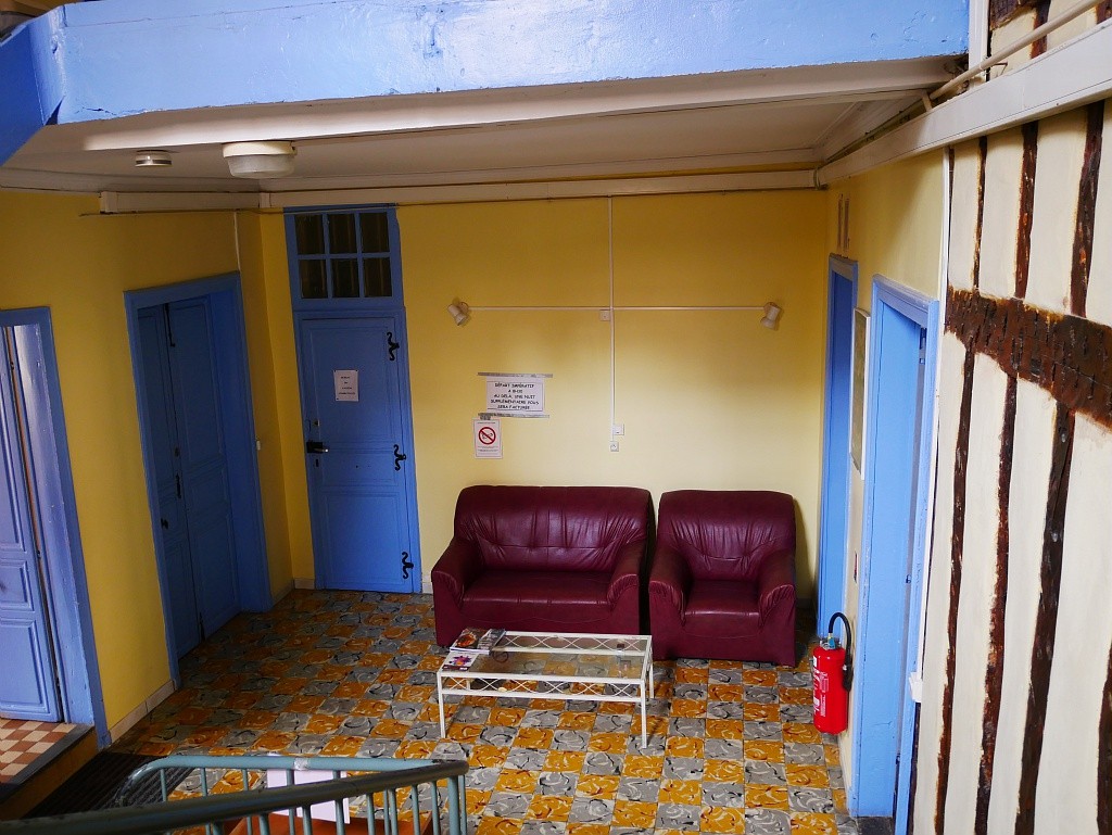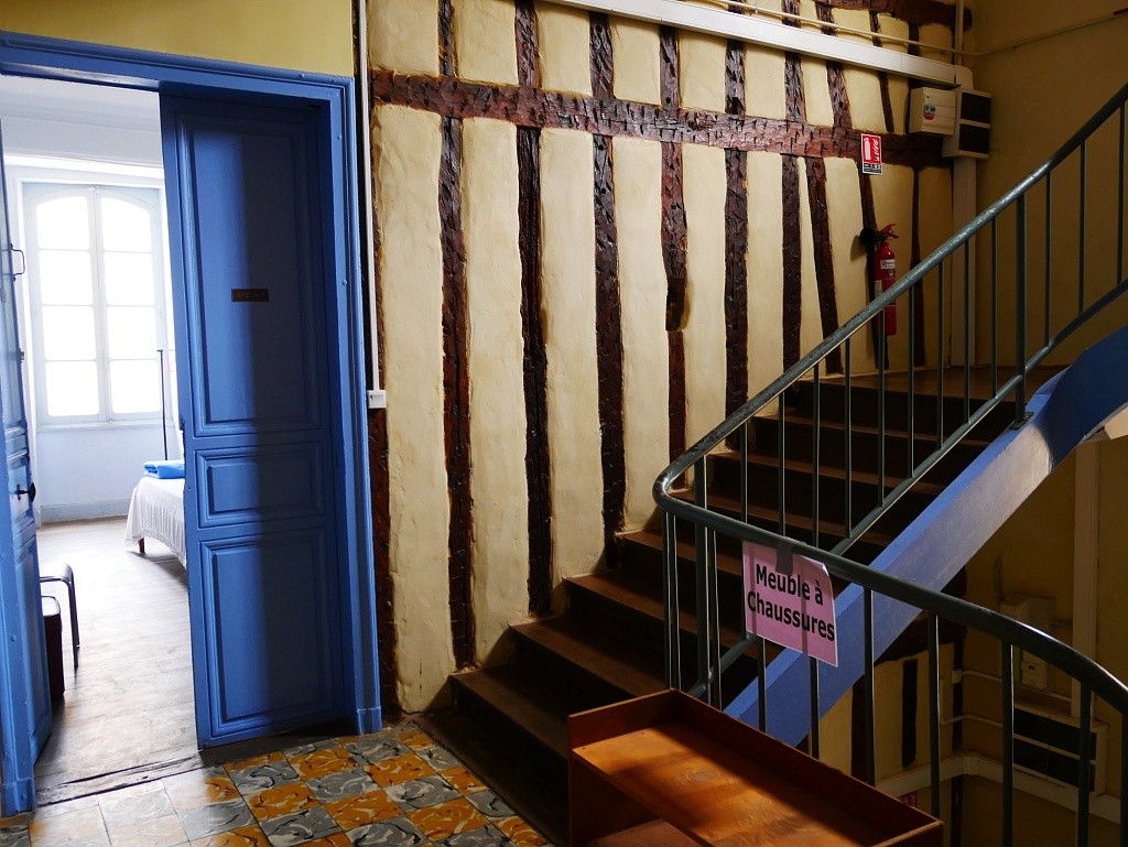 Zwei Kilometer vor Eauze spaziert vor mir eine mit Tagesrucksäcken ausgestattete Wandergruppe durch den Wald. Vermutlich sind das genau diese Art von Pilger, die den von mir verächtlich angesehenen Transportservice nutzen. In Eauze versucht Etienne auf der Straße Schabernack mit mir zu treiben. Von hinten schleicht er an mich heran. Blöd für ihn, dass sein Vorhaben nicht klappt. Bevor er mich erschrecken kann, zeichnet sich seine Spiegelung im Schaufenster ab. Er hatte schon in der Gite eingecheckt und begleitet mich für die Anmeldung in die Touristeninfo und anschließend in die Gite, die sich direkt nebenan befindet. Ein mehrstöckiges Gebäude mit einem interessanten Charme. Eine einfache Unterkunft, die viele Gelegenheiten bietet, mit anderen Pilgern in Verbindung zu kommen. Die Küche mit dem großem Esstisch lädt förmlich dazu ein.
